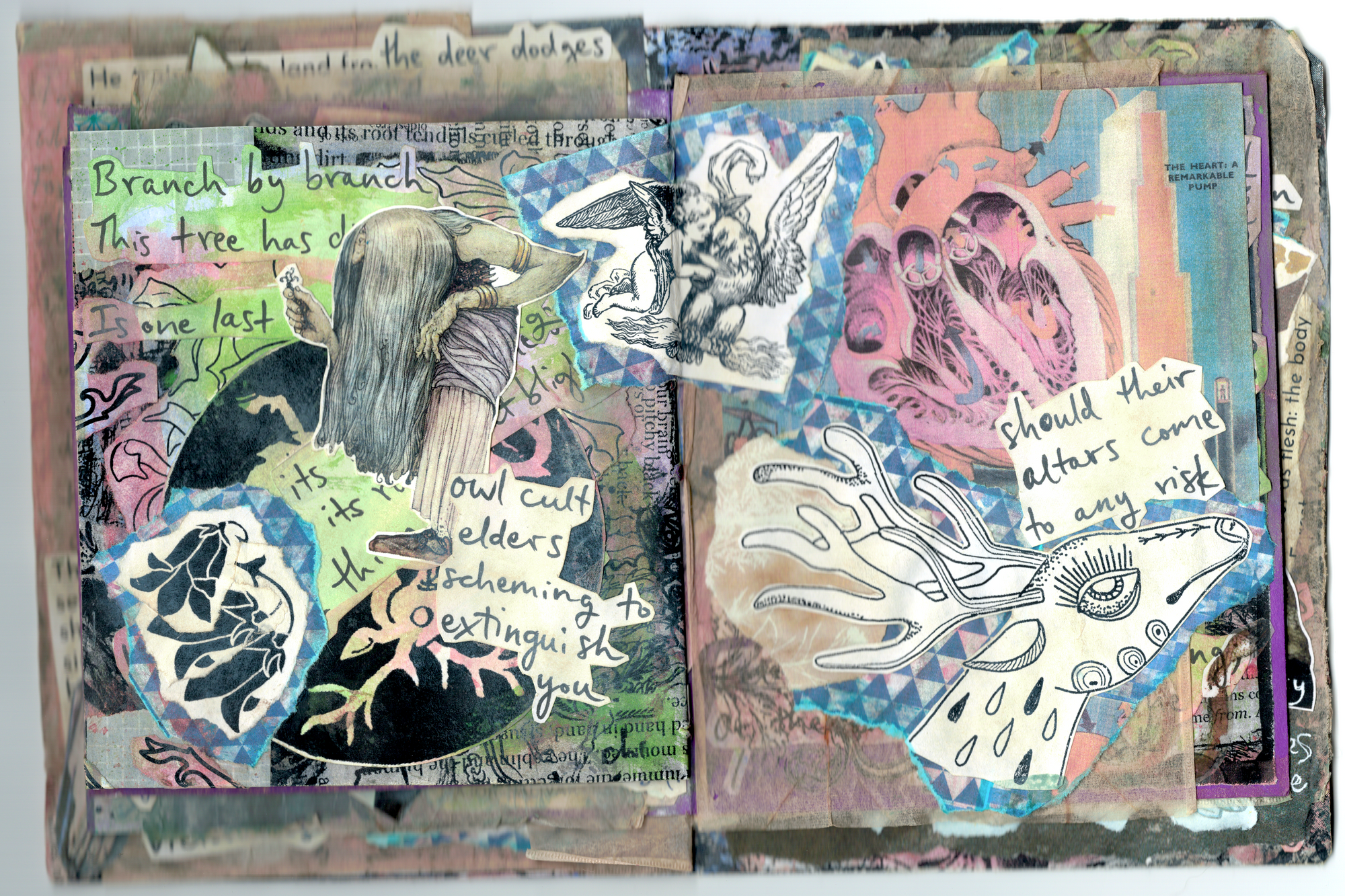 Now you are in a clearing, presided over by a council of owls. It is twilight and indigo cloaks your eyes. The tallest owl gestures emphatically with his long wing and releases a burst of pale feathers. You are still weak. Still bereft of what you abandoned in the woods.