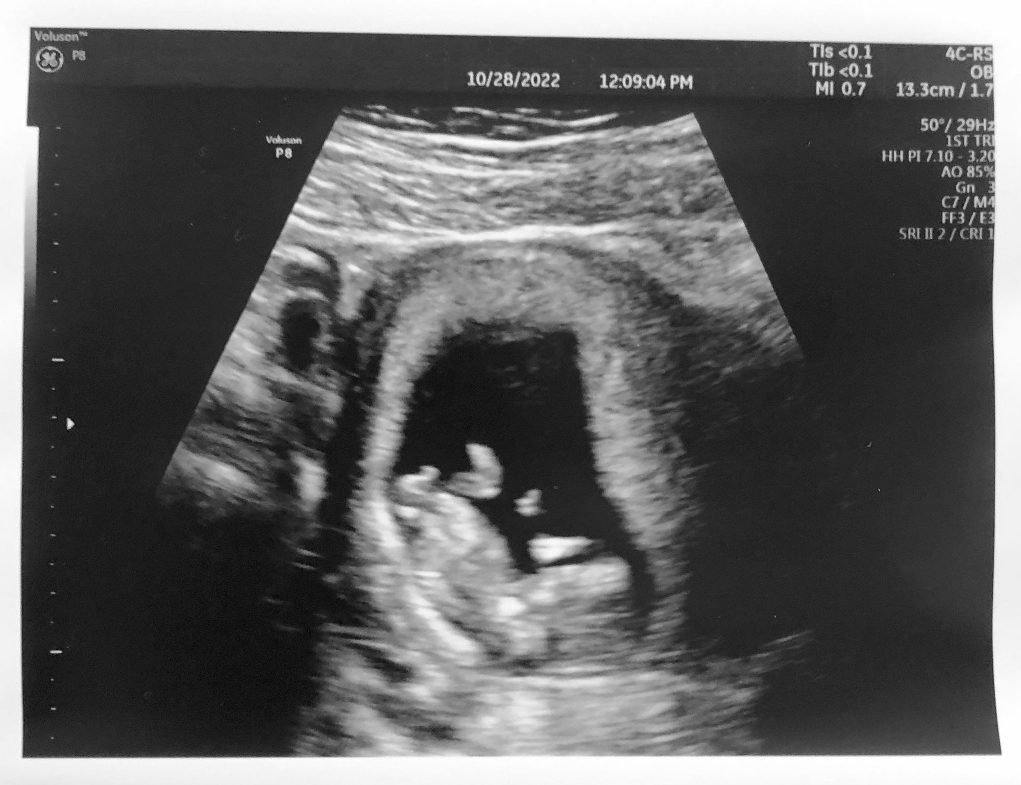 Guess what: I'm pregnant. A baby is growing inside my abdomen. My uterus has more than doubled in size and produced an entire new organ, the placenta. Plus my child's organs, sketches in miniature — the heart has been fluttering for more than a month! We saw it on the first ultrasound. Then today at the 12-week ultrasound, kicking legs.
